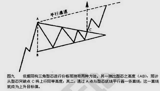 同构三角型态最简单的测算方法是量出三角型态之最高度和三角型态之宽度(即水平方向的时间间隔),预计从三角型态的突破点将反弹的距离(高度)为基本高度。