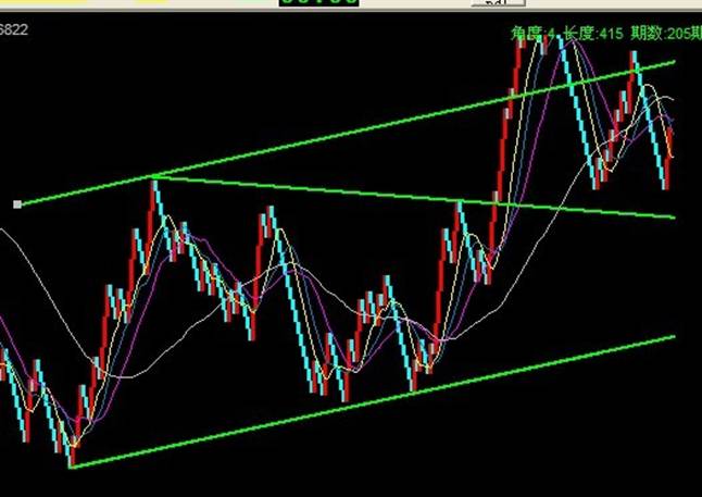 第二种测量方法就是从基部之顶端画一条与下方趋势线平行之趋势线,这一趋势线就成为上升趋势中的上升目标值。