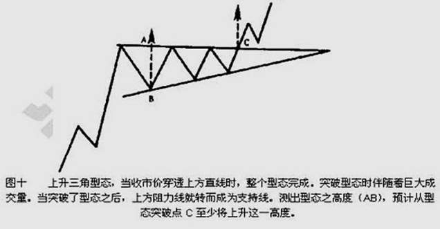 上升三角型态是同构三角形态之变形,但是有不同的含义,如图十所示,表明市场买压力大于卖压,是一个牛市型态。不论出现在价格趋势运动的哪个阶段,都具确定预测作用。发生上升突破时一般是收市价穿透上端水平趋势线,成交量增大,同时也常常随后发生回调,这时成交量减小。