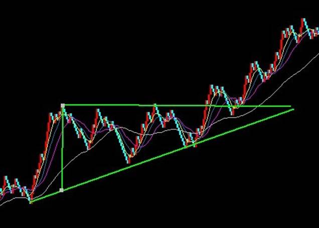 上升三角型态的测量方法比较简单。首先测出型态之高度,预计从形态突破点将向上运动同样的高度。