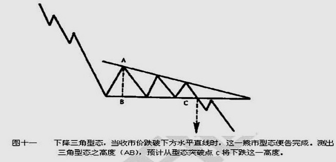 下降三角型态一般被认为是一种型态,如图十一所示,表明市场卖方压力大于买方力量。当收市价低于下端趋势线时发出下滑信号,通常成交量增大,回弹将在下端趋势线附近遇阻。