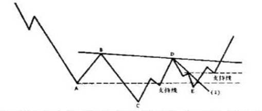 有些采用测量C至D点距离的方法,也就是在上升到CD距离50%至60%的时候买入。另一种方法是从D到E点画一条趋势线,在向上穿透这一趋势线时买入,或者根据一般情况下型态对称特性,在右肩接近左肩最底部时买入。