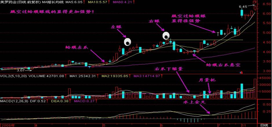 这样要求的原因就是,只有庄家控盘了蛤蟆右爪子才能悬空,只有成交量萎缩成芝麻点了才说明洗 盘基本完成了,拉升不远了,一旦后期突破蛤蟆眼睛,并得到指数的配合,就进入上升行情 。