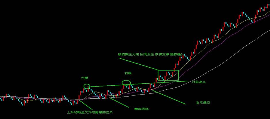 (2)当股价回落不久,并且再度上升时的高点形成蛤蟆的右眼。