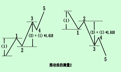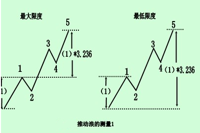 ①在一个推动浪中,第5浪浪顶的极限为第1浪幅度的3.236(1×1.618)倍,加上第1浪的顶点;最低幅度为加上第1浪的起点。