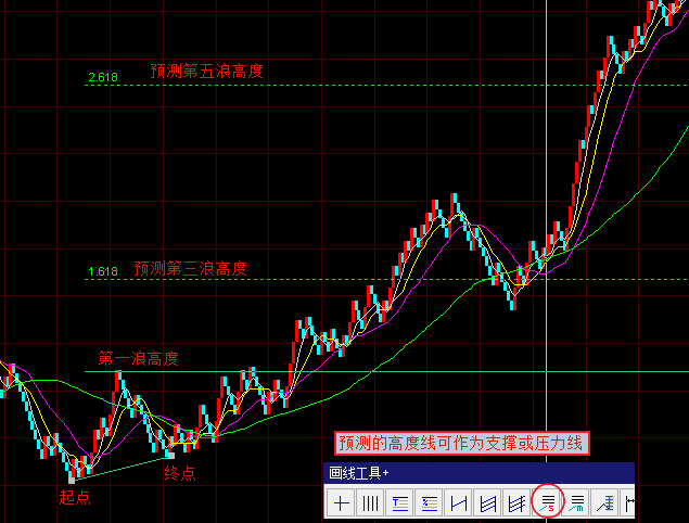 预测小浪是在第一浪起点按鼠标拉到第二浪终点放鼠标就能预测第三浪和第五浪的高度。
